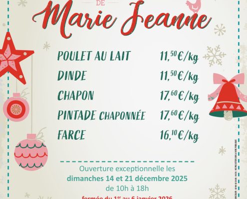 À la ferme de Marie Jeanne, les volailles sont élevées en plein air avec une alimentation composée de céréales sans antibiotiques et sans OGM. Marie Jeanne a voulu par la suite collaborer avec les autres producteurs locaux en vendant leurs produits. Aidée par sa belle-fille Coline Avril, elle a ouvert le magasin à la ferme en 2016.